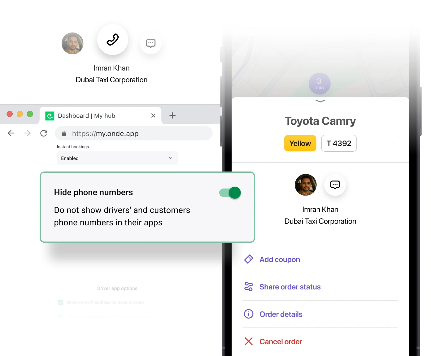 Ocultar o número de telefone oferece aos motoristas uma forma segura e voltada para a privacidade de se conectar com os clientes. Pode ser configurado facilmente pelos gerentes da empresa.
