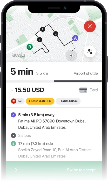 App Chauffeur personnalisable pour iOS et Android. Tout ce dont un chauffeur a besoin pour bien faire son travail : une inscription en ligne facile, des paiements en espèces et par carte, une option pour contacter et évaluer les passagers, un algorithme intelligent pour attribuer les commandes.