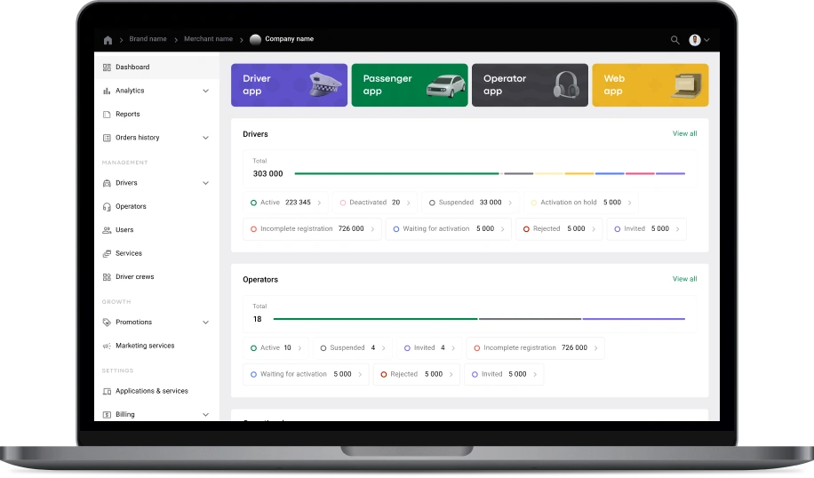 Système d'administration permettant de gérer les chauffeurs et les opérateurs, de mettre en place des programmes de parrainage et d'analyser l'efficacité de votre entreprise de VTC.