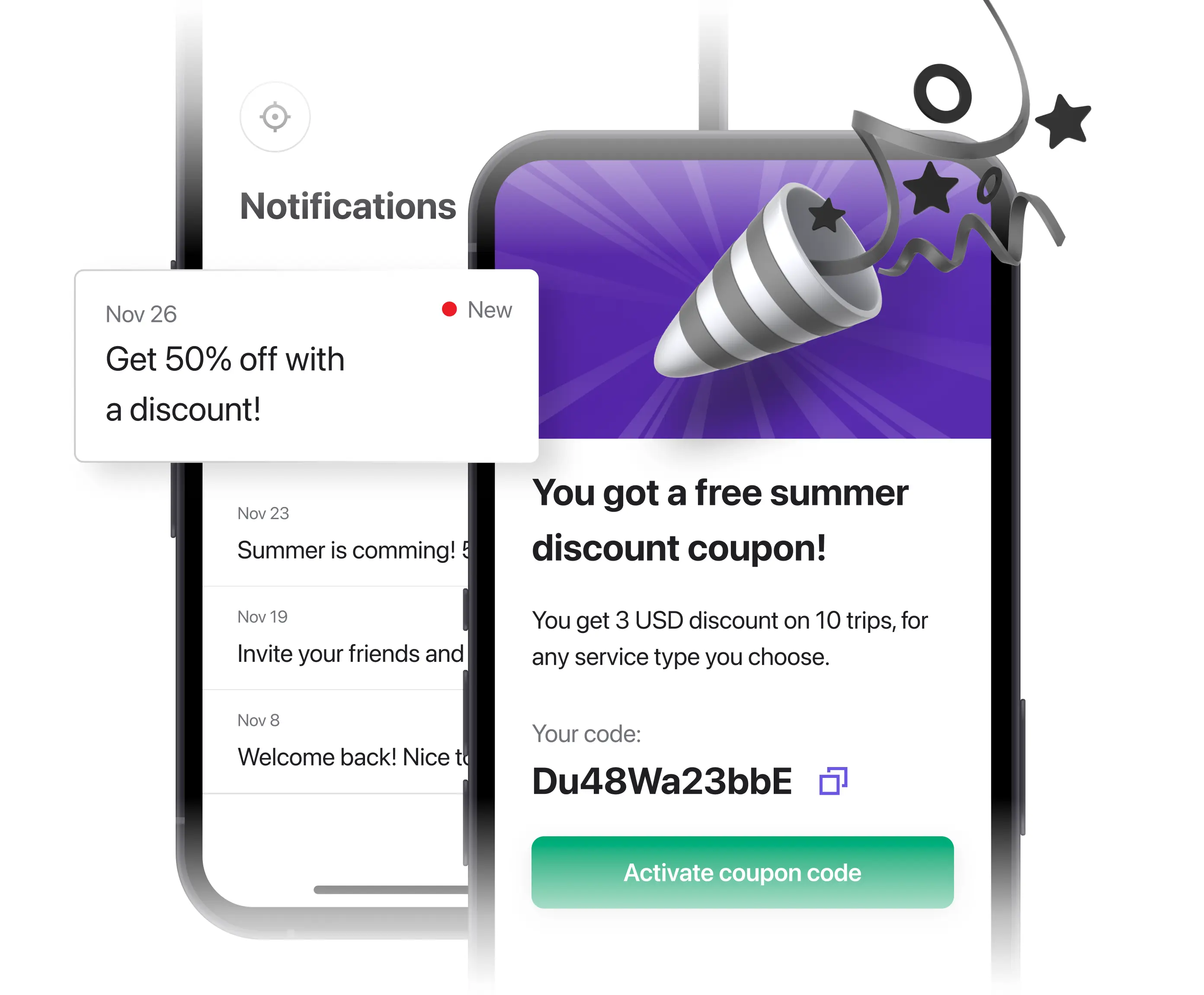 Obtenha mais utilizadores e mantenha-os fiéis, oferecendo descontos, actualizando-os sobre as notícias da empresa e dando recompensas por referências. Utilize notificações para quaisquer actividades de marketing na aplicação.